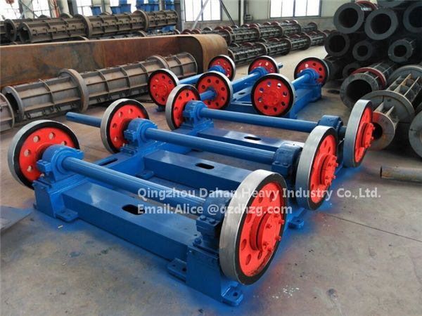 The centrifugal machine is mainly used to manufacture the centrifugal equipments manufacturing the reinforced concrete drainpipes, driving the spinning of the drainpipe concrete pipe mold loaded with some concrete and reinforcing steel with a certain mixing ratio at different speeds, and  the solid phase particles of concrete in steel mould will be centrifugal settling in the steel mould inner surface under centrifuge, meanwhile draining the excessive water, thus forming compacting concrete structure namely reinforcing concrete drainpipe. The machine mainly consists of riding wheels, shafts, bearing block, bearing, V-blet pulley, base and electromagnetic speed-controlling motor.